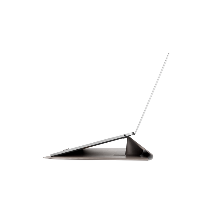 Elevate your workspace anywhere. Made from splash-resistant vegan leather with an inner microfibre lining, this slim sleeve stores and secures laptops in a compact profile with an easy magnetic closure. Its smart convertible cover folds in seconds and snaps magnetically into an optimised 25-degree stand for long hours of comfort working at your desk or cafe.
